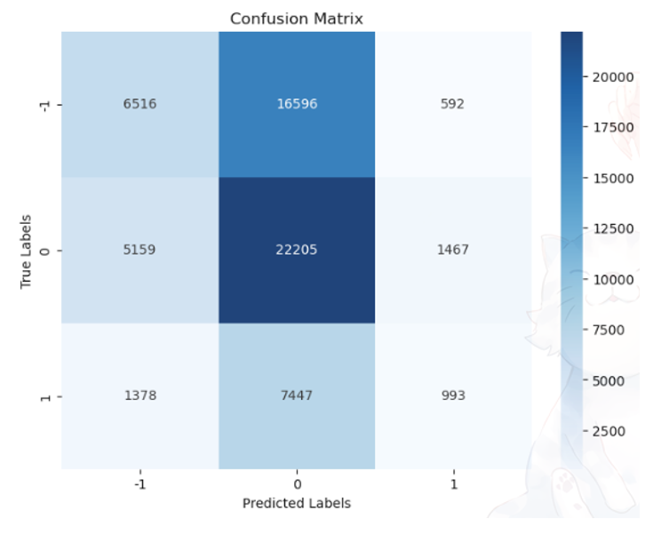 Sebagai perbandingan, disajikan pula Gambar di bawah berupa confusion matrix pada dataset A, praproses 1, prediksi 1, dan threshold -3 s.d 3. Meskipun jumlah sentimen yang dihasilkan Yake dan FastText sama seperti threshold 0 pada Gambar di bawah, tetapi pada threshold -3 s.d 3, confusion matrix yang dihasilkan akan cenderung berpusat pada sentimen netral. Jatuhnya sebagian besar prediksi pada sentimen netral disebabkan karena penggunaan threshold -3 s.d 3.