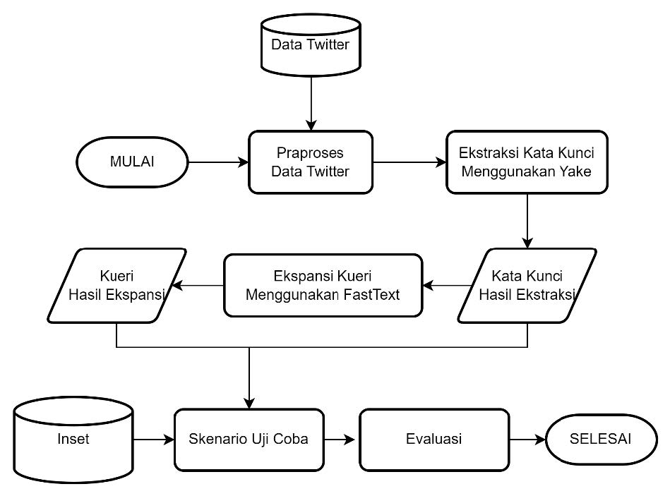 Pada kerja praktik ini akan dibuat sebuah sistem yang dapat meningkatkan akurasi sentimen analisis menggunakan pendekatan ekstraksi kata kunci dan ekspansi kueri menggunakan Yake dan FastText. Dataset yang digunakan merupakan dua buah dataset Twitter yang telah di-scrapping dan telah dianotasi dengan sentimen positif, netral, dan negatif. Kedua dataset tersebut memiliki perbedaan karakteristik data, sehingga pada penelitian kali ini dataset tersebut dipisah, dan diberi nama dataset A (single-context imbalance) dan dataset B (multi-context balance). Kemudian dataset Twitter yang telah didapatkan akan dilakukan beberapa tahapan guna mendapatkan hasil sentimen. Adapun tahapan-tahapan yang dilakukan yakni: praproses, ekstraksi kata kunci menggunakan Yake, ekspansi kueri menggunakan FastText, penggunaan InSet, melakukan skenario praproses, melakukan skenario uji coba, serta tahapan akhir yaitu evaluasi. Pada evaluasi akan dilakukan penilaian sentimen analisis berdasarkan akurasi dan F-1 score. Adapun diagram alir mengenai metode penelitian ini dapat dilihat pada Gambar di bawah.