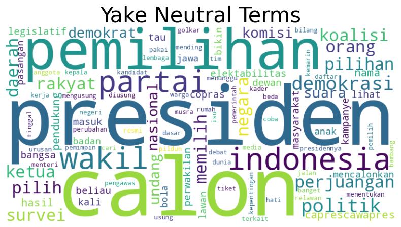 Setelah tahap praproses data Twitter, dilakukan ekstraksi kata kunci menggunakan Yake. Ekstraksi kata kunci dilakukan terhadap sentimen positif, netral, dan negatif. Selain itu konfigurasi parameter Yake juga dilakukan guna meningkatkan performa secara optimal. Parameter Yake yang digunakan adalah ngram=1, windowSize=1, dedupLim=0.9, dedupFunc=’seqm’, dan top=100.