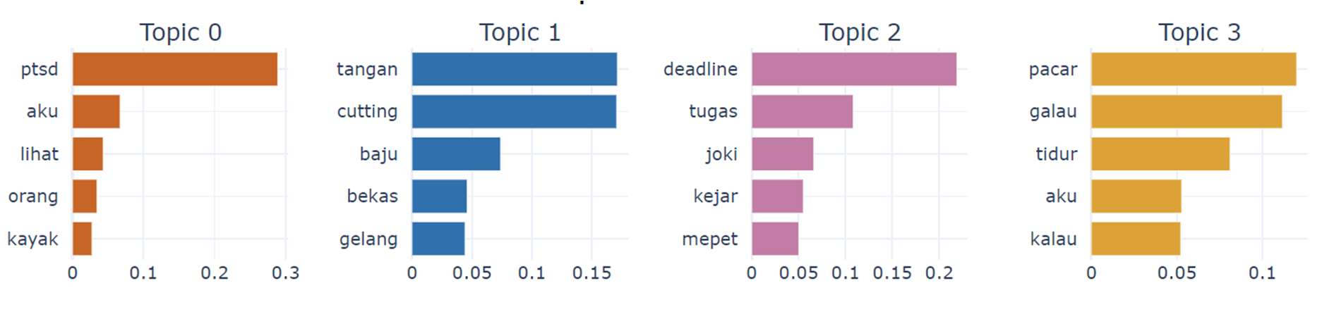 Among these parameters, nr_topics 5, min_topic_size 20, and coherence value 0.6194 were chosen. Although the nr_topics parameter, which represents the number of extracted topics, was set to 5, one topic with a value of -1 was obtained. This value of -1 indicates that the topic does not have strong meaning, so topics with a value of -1 will not be used. The result of the topic modeling process includes several topic categories shown in Figure below. The topic categories are divided into four, labeled as topics 0 to 3: trauma, self-harm, workload burden, and relationships.