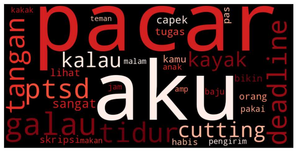 The predicted data from the IndoBERT model will be combined with manually labeled data. From this data, labeled stress data will be used to determine stress categories using BERTopic. The distribution of words in the stress label can be seen in Figure below.