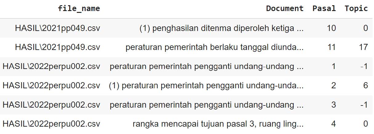 The topic modeling in this study utilizes the BERTopic model. This model is based on the transformer architecture of the BERT (Bidirectional Encoder Representations from Transformers) to obtain word representations from the text, which is then used to group documents into their respective topic clusters. The clustering results of BERTopic on the legal regulation dataset used in this study can be seen in the image below.