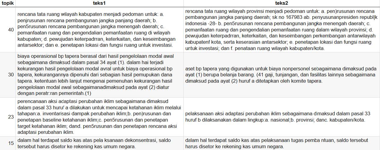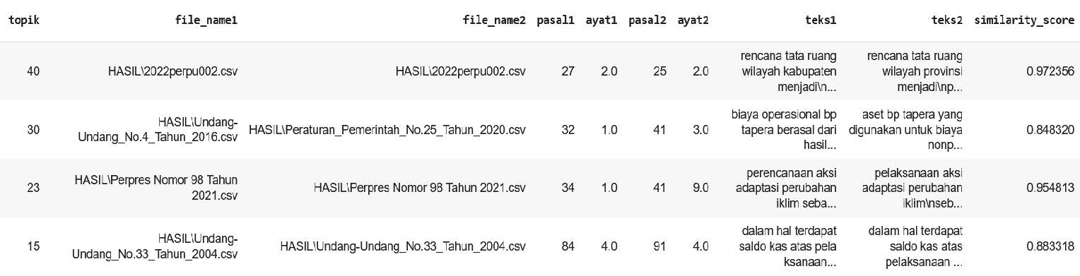The model's prediction results also include information about the inconsistent sentence pairs detected. An example of the table data obtained from the model regarding detected inconsistent sentence pairs can be seen in the image below. A comparison of these sentence pairs can be seen below.