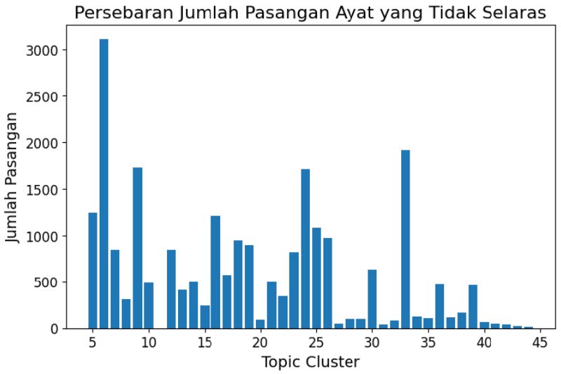 Based on all the testing scenarios conducted, the model with the best performance is used for predictions on the entire dataset of 110 PUU documents. Before using the model, this dataset underwent the preprocessing steps explained in the methodology section, including preprocessing sentence pairs, clustering based on topic modeling, and selection using cosine similarity with a threshold of 0.75. Next, the sentence pair data underwent prediction to detect inconsistencies in the relationships between these sentence pairs. The image below shows the distribution of detected inconsistent sentence pairs based on topics.