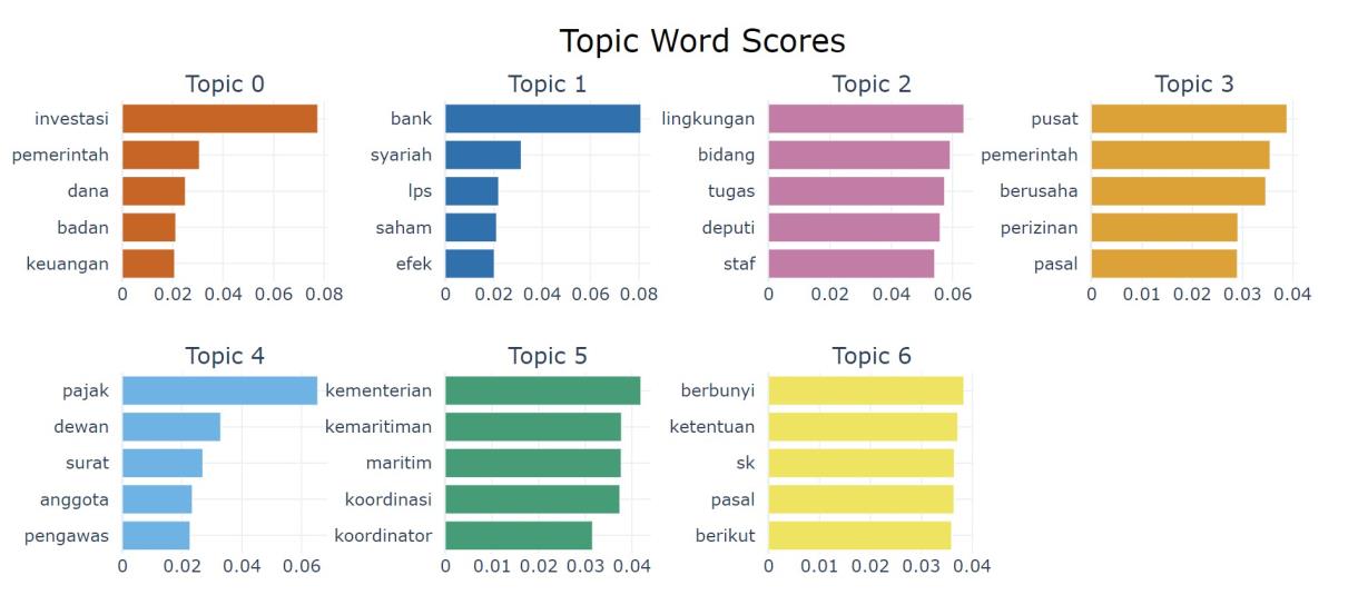 The total clustering BERTopic on this legal regulation dataset reaches 47 topics, with a complete distribution of topic clustering available in the attached documents. It can be observed that 'Topic 0' contains words such as investment, government, funds, agencies, and finance, indicating that this topic broadly discusses "Government Regulations in Managing Investment, Funds, and Financial Affairs of Business Entities." On the other hand, 'Topic 1' discusses "The Role of Conventional and Sharia Banks, as well as LPS in Regulating Stocks and Financial Securities," with words such as banks, Sharia, LPS, stocks, and securities suggesting the general outline of this topic.